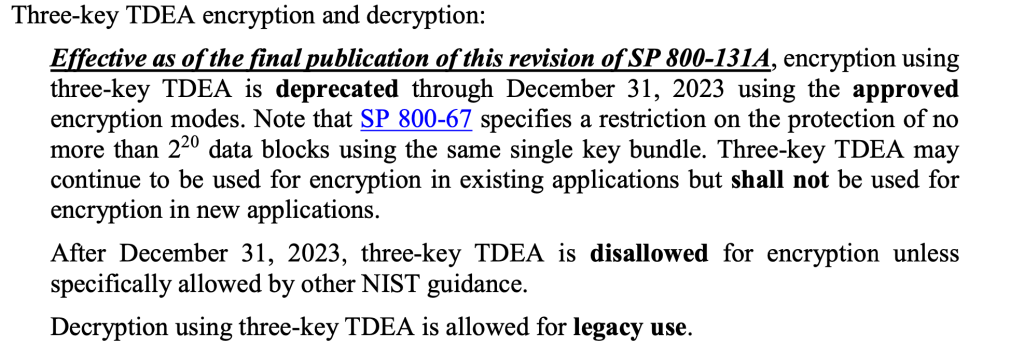 The latest revision of SP 800-67 disallows the use of two-key TDEA for applying cryptographic protection and restricts the use of three-key TDEA for applying cryptographic protection to no more than 220 data blocks using a single key