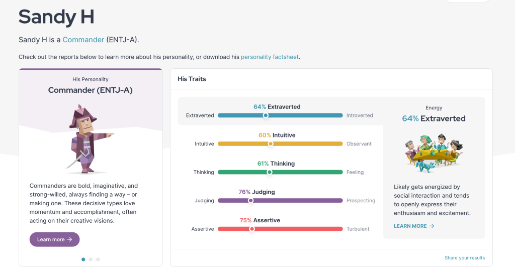 I was testing a personality test using www.16personalities.com. And i did conduct testing was in 2022 The result that i got is Commander 😀.