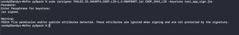$ sudo jarsigner <your_jar_name> <your_lib_name> -keystore <your_jks_file.jks>
